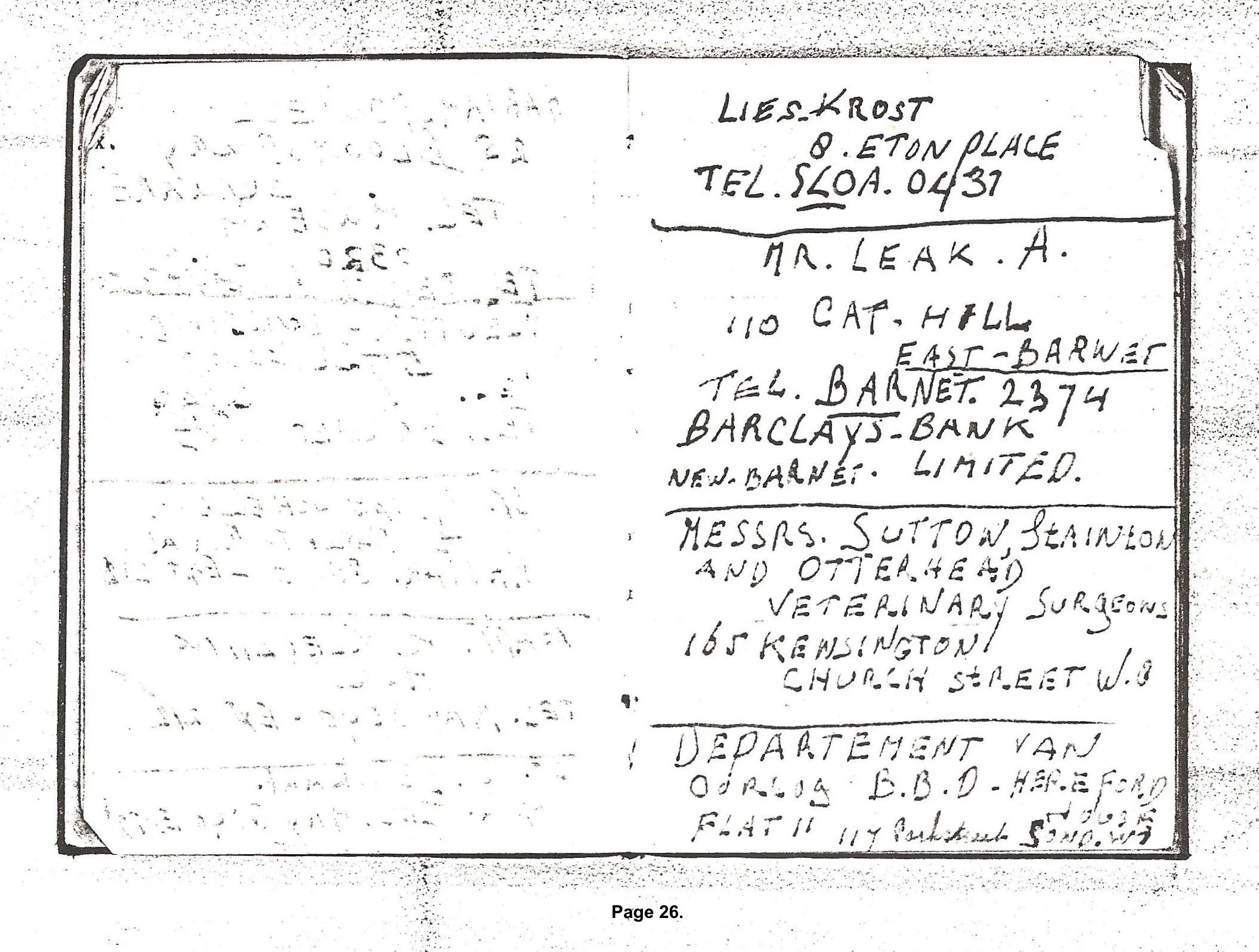 Tobs was not fluent in English and often used a phonetic or Dutch spelling for similar sounding words in his diary: "foon" for "phone" or "Norfolkstr" instead of "Norfolk Street", "Kursen St" for "Curzon Street". Sometimes Eva would make entries as well as others which you will see going through the pages.